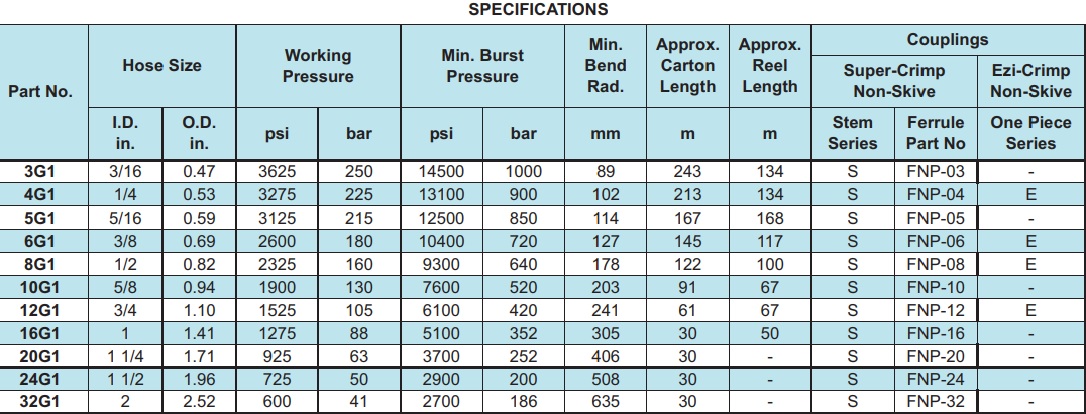 Applications: Medium pressure hydraulic lines. Meets or exceeds the requirements of SAE 100R1, ISO 1436 1SNR1 and EN 853 1SN.