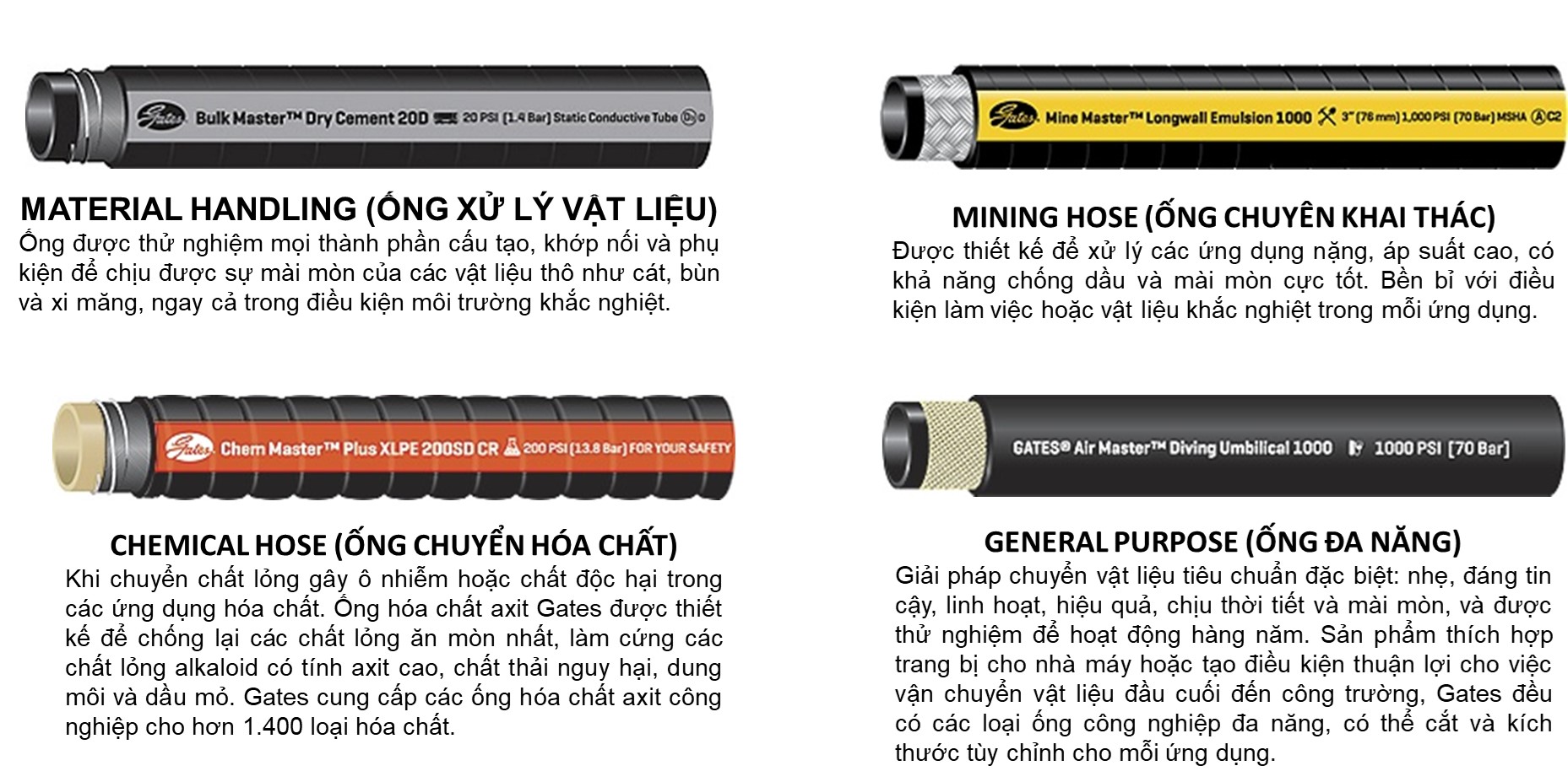 Ống công nghiệp của Gates được thiết kế với độ bền và hiệu suất cao trong điều kiện nhiệt độ, áp suất và các chất gây ô nhiễm khắc nghiệt xác định những thách thức trong ngành khai thác. Cùng với các ứng dụng trong ngành khai thác như: hút - xả và vật liệu không khí / chất lỏng,... Ống Gates luôn được thiết kế với các thông số đáp ứng hoặc vượt trội hơn cả thông số kỹ thuật OEM và quy định về hiệu suất, an toàn và chức năng.